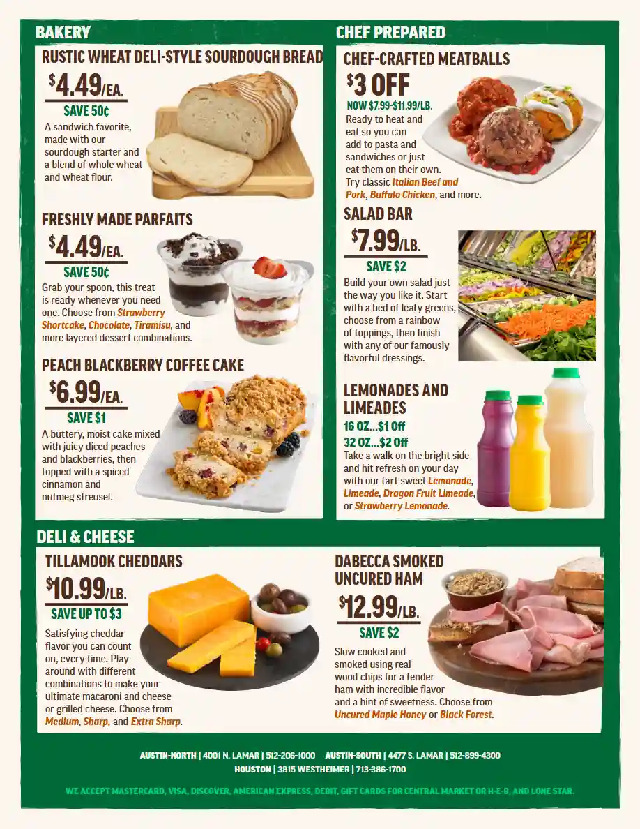 The Central Market weekly flyer is easy to navigate, with sales organized by category, making it simple to see if the products you need are on sale. Be sure to check next week’s Central Market ad to ensure you’re getting the best prices and avoid overspending.